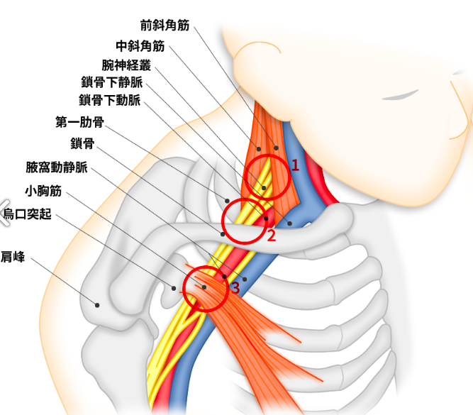 肩の関節の動きに問題ない場合、この1、2、3の首から出ている神経や血管が圧迫されている可能性があり、この通りを中心に筋肉を緩める必要があります。